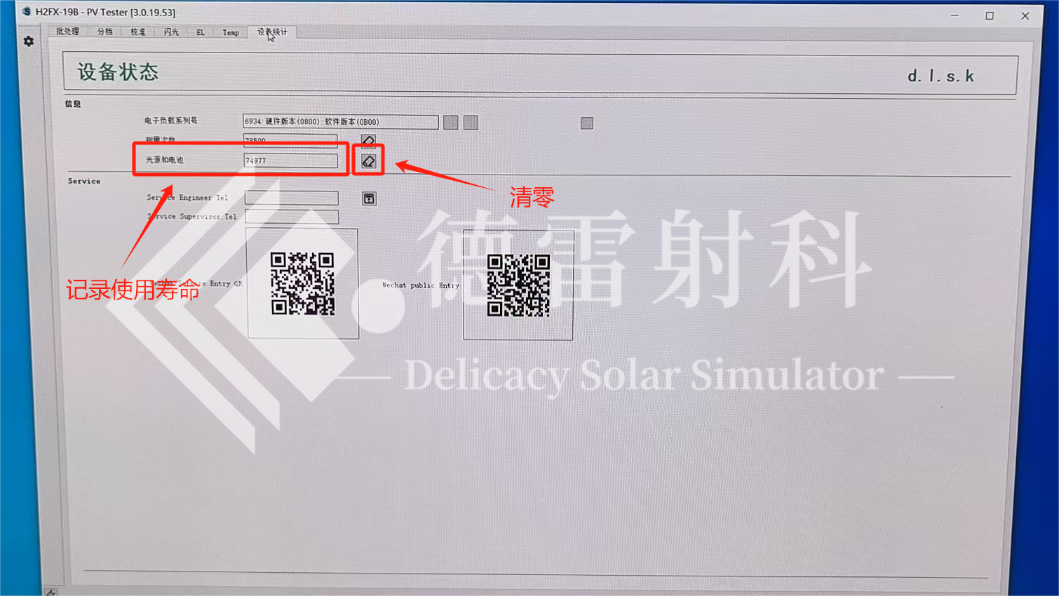7 、打開軟(ruǎn)件,在“設備"界面記(jì)錄舊氙燈(dēng)使用壽命,然後(hòu)清零
